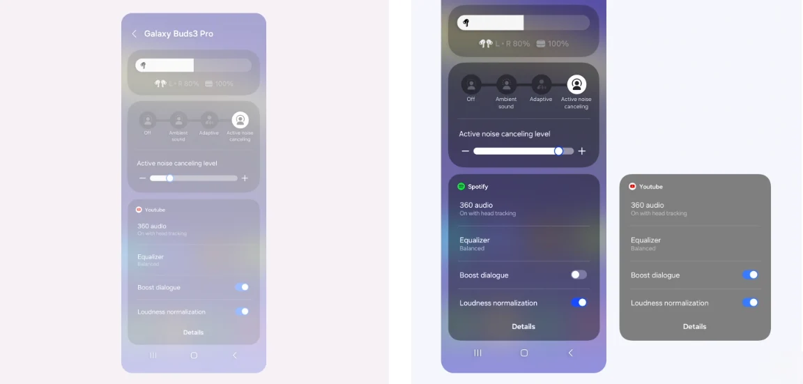 Affinez votre audio directement à partir du panneau des paramètres rapides. Il vous suffit de faire glisser votre doigt vers le bas depuis le haut de l’écran, d’appuyer sur le curseur de volume ou l’icône Buds et de les maintenir enfoncés, puis de régler les paramètres de bruit et de son. Mieux encore, vos paramètres audio préférés sont désormais enregistrés pour chaque application. Il suffit de les ajuster dans le panneau des paramètres rapides pendant que l’application lit le contenu multimédia. Que vous aimiez 360 Audio sur YouTube ou préfériez l’égaliseur d’amplification des basses sur Spotify, votre audio est toujours réglé comme vous l’aimez.