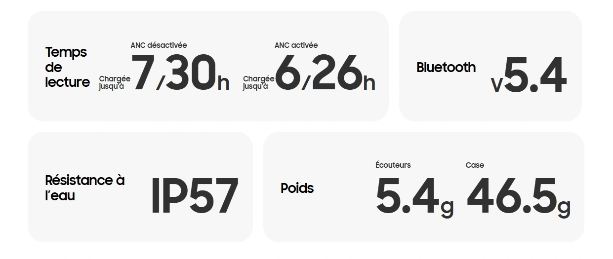 Redéfinissez votre expérience d’écoute. Écoutez chaque note dans une clarté cristalline, avec CODEC 24-bit. Réduisez les distorsions avec notre tout premier double amplificateur sur Galaxy Buds. Capturez une grande variété de détails complexes avec un haut-parleur bidirectionnel amélioré et un tweeter planaire, une première sur les Galaxy Buds. Faites passer votre expérience d’écoute au niveau supérieur avec le contrôle du bruit optimisé par Galaxy AI et l’interprétation en temps réel. Redécouvrez vos Buds sous un nouveau jour.