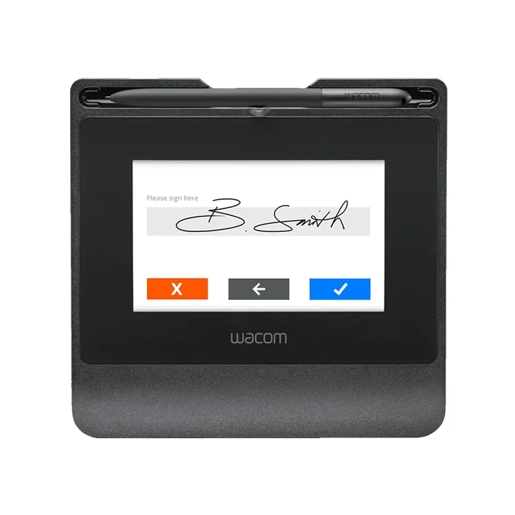 Le bloc-notes de signature numérique Wacom, leader du secteur, ainsi que le stylet numérique Wacom breveté sans fil et sans pile, rendent la signature de documents aussi rapide et facile qu’avec un stylo et du papier traditionnels.